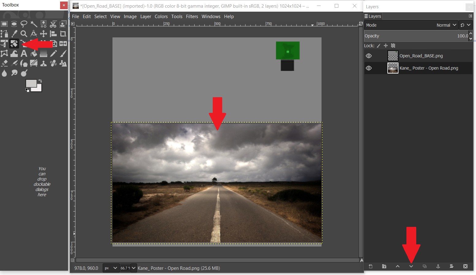 Optional: If your editing program allows layers, lower your image beneath the poster by selecting the Lower button (arrow down – beneath the red arrow on the bottom right hand side of the example picture). This will ensure part of the image doesn’t accidentally show on the back of the poster. This is optional however, as not all picture editing programs use layers.