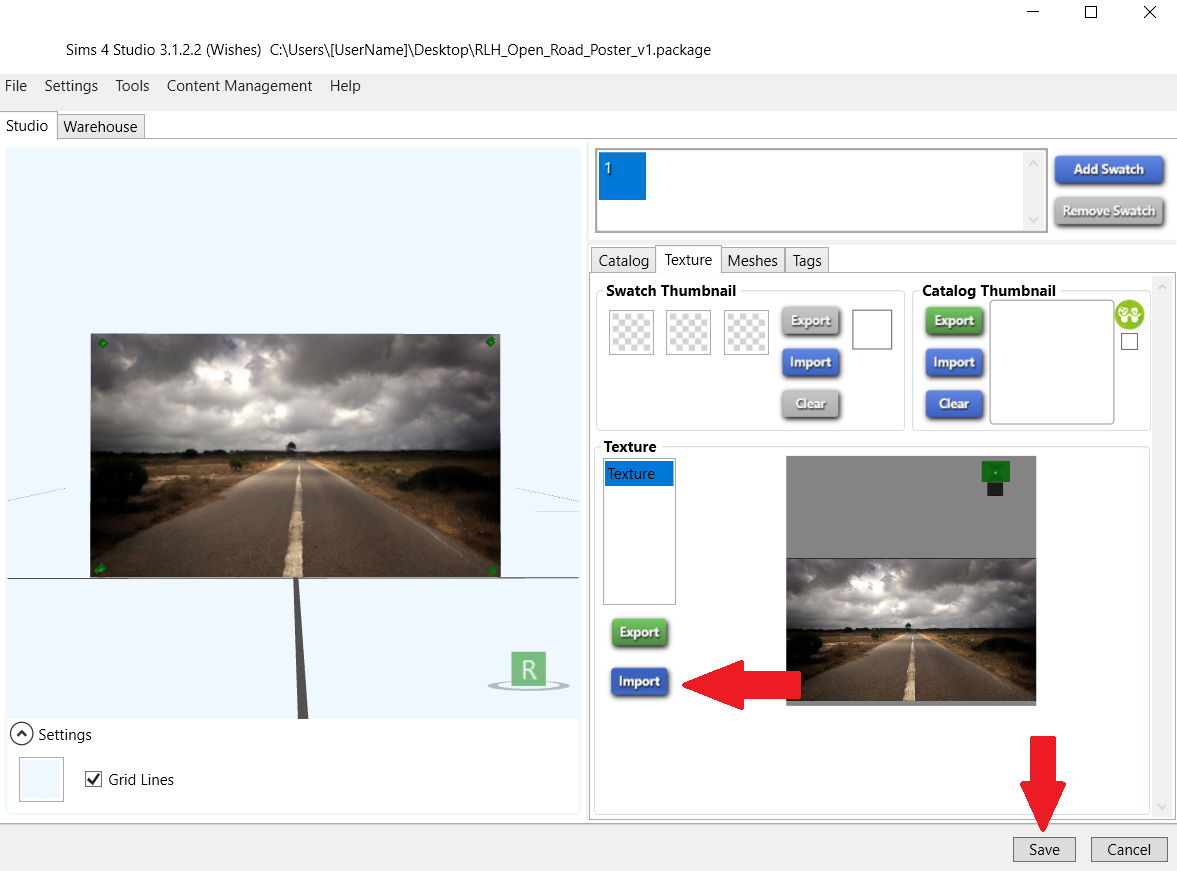 Step 4 – You should see the Studio window open (similar to above). Under the Catalog tab (the top red arrow) type in the name of your project. This is the name you will see in the build/buy catalog so choose wisely to make it easier to find in search (So for example, I changed the name of my project from Voidcritter Poster to RLH_Open Road poster. In the Description field, type in anything you’d like that will again show in the build/buy catalog in game. You can change the price or leave it as is. When you’re happy with it, select Save.